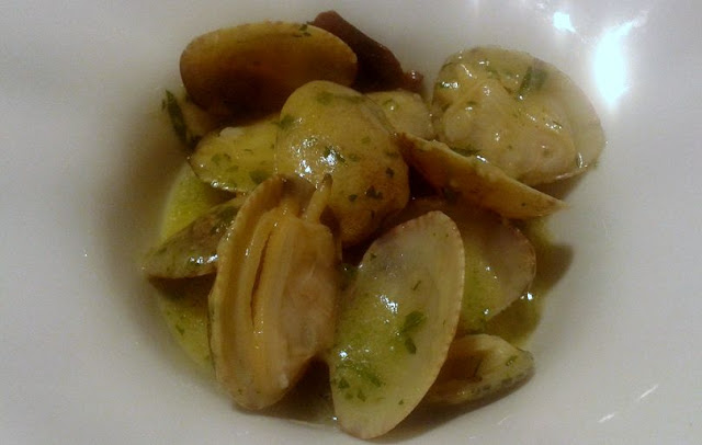 Ahora ya pasamos a las almejas finas de Santoña en salsa verde. Presentación individual de buenas almejas con una rica salsa. Esto es disfrute asegurado. Untar pan se hace indispensable.